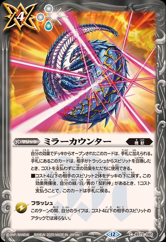 自分の効果でデッキからオープンされたこのカードは、手札に加えられる。手札にあるこのカードは、相手がトラッシュからスピリットを召喚したとき、コストを支払わずに次の効果をただちに使用できる。■コスト4以下の相手のスピリット2体をデッキの下に戻す。この効果発揮後、自分の緑/白/青の「契約神」があるとき、1コスト支払うことで、このカードは手札に戻る。フラッシュこのターンの間、自分のライフは、コスト4以下の相手のスピリットのアタックでは減らない。