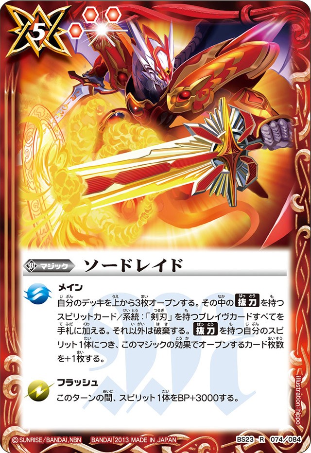 自分のデッキを上から3枚オープンする。その中の【抜刀】を持つスピリットカード/系統:「剣刃」を持つブレイヴカードすべてを手札に加える。それ以外は破棄する。【抜刀】を持つ自分のスピリット1体につき、このマジックの効果でオープンするカード枚数を+1枚する。
