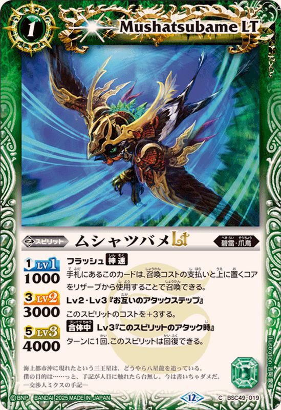 <5>4000フラッシュ__神速_手札にあるこのカードは、召喚コストの支払いと上に置くコアをリザーブから使用することで召喚できる。Lv2・Lv3_『お互いのアタックステップ』このスピリットのコストを+3する。_合体中__Lv3_『このスピリットのアタック時』ターンに1回、このスピリットは回復できる。