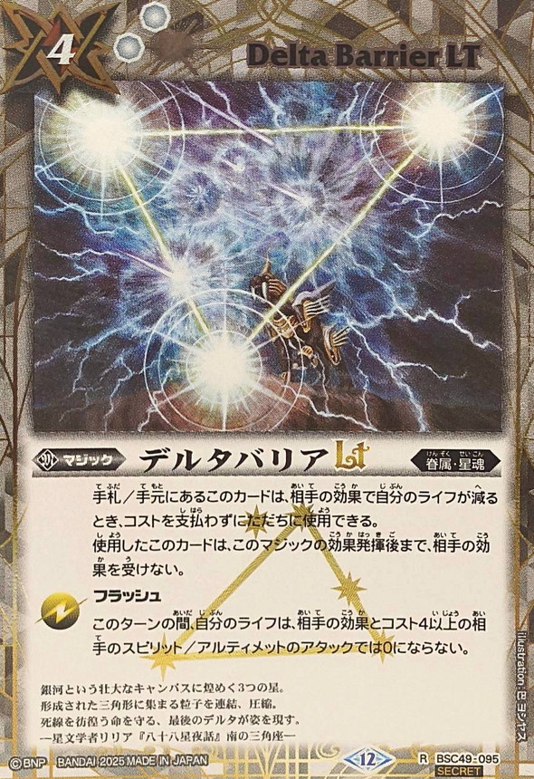 手札/手元にあるこのカードは、相手の効果で自分のライフが減るとき、コストを支払わずにただちに使用できる。使用したこのカードは、このマジックの効果発揮後まで、相手の効果を受けない。フラッシュこのターンの間、自分のライフは、相手の効果とコスト4以上の相手のスピリット/アルティメットのアタックでは0にならない。銀河という壮大なキャンバスに煌めく3つの星。形成された三角形に集まる粒子を連結、圧縮。死線を彷徨う命を守る、最後のデルタが姿を現す。―星文学者リリア『八十八星夜話』南の三角座―