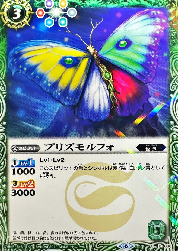 3(赤1紫1緑1白1黄1青1)/緑/怪虫 <1>Lv1 1000 <3>Lv2 3000 Lv1・Lv2 このスピリットの色とシンボルは赤/紫/白/黄/青としても扱う。 シンボル:緑 イラスト:原友和 フレーバーテキスト: 赤、紫、緑、白、黄、青のまばゆい光に包まれて、 気が付けば目の前に6色に輝く蝶が現われていた。