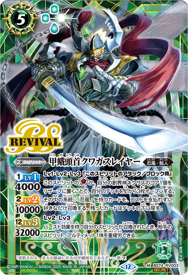 <12>32000Lv1・Lv2・Lv3_『このスピリットのアタック/ブロック時』このスピリットの__か、自分の創界神ネクサスのコア1個をリザーブに置くことで、自分のデッキを上から3枚オープンする。その中の系統:「忍風」を持つカードを、コストを支払わずに好きなだけ召喚する。残ったカードはデッキの下に戻す。Lv2・Lv3バースト効果を持つ自分のスピリットが召喚されたとき、相手のスピリット/アルティメット1体を重疲労できる。