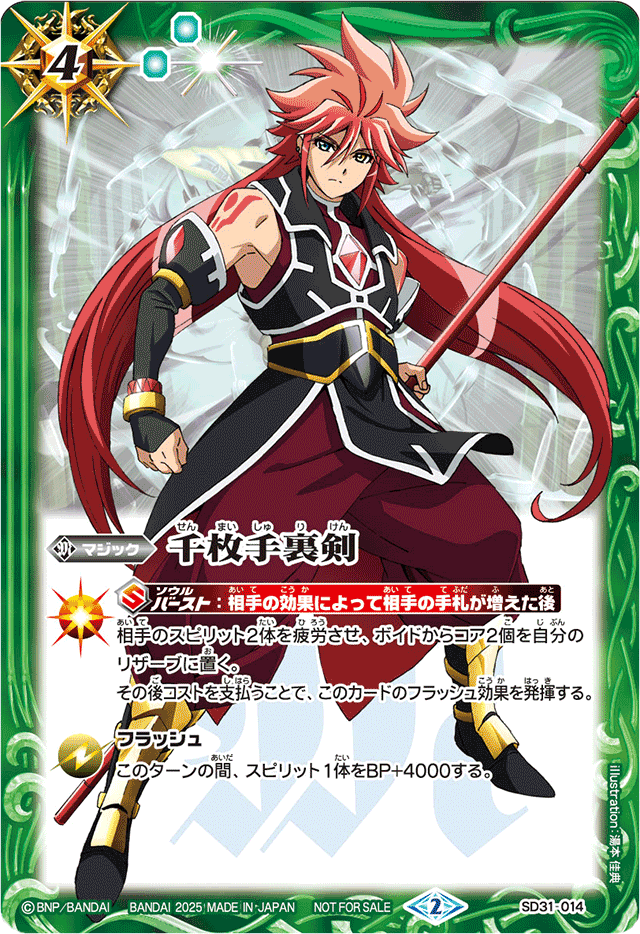 4(2)/緑 【Sバースト:相手の効果によって相手の手札が増えた後】 相手のスピリット2体を疲労させ、ボイドからコア2個を自分のリザーブに置く。 その後コストを支払うことで、このカードのフラッシュ効果を発揮する。 フラッシュ: このターンの間、スピリット1体をBP+4000する。