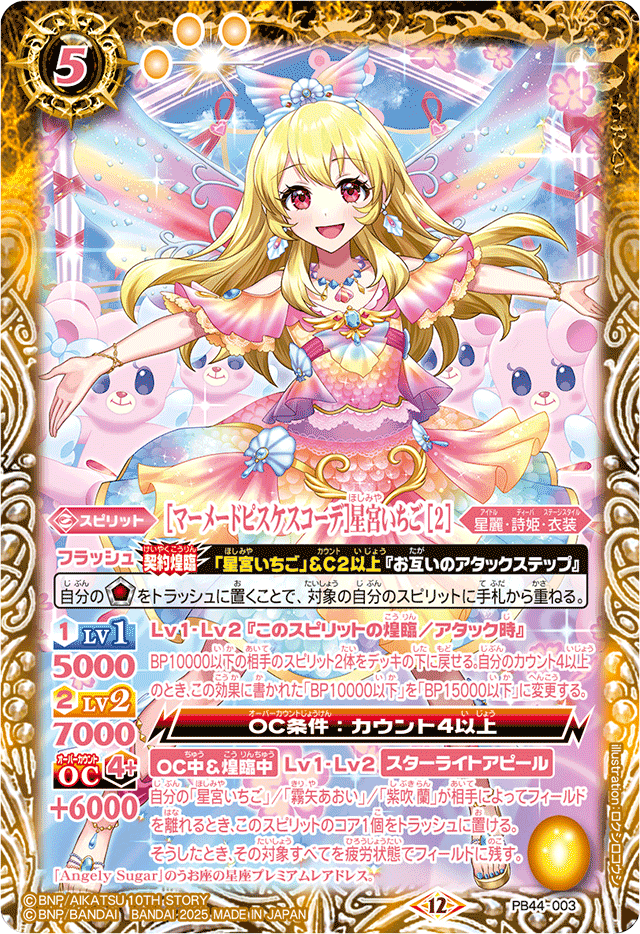 自分の「星宮いちご」/「霧矢あおい」/「紫吹 蘭」が相手によってフィールドを離れるとき、このスピリットのコア1個をトラッシュに置ける。
