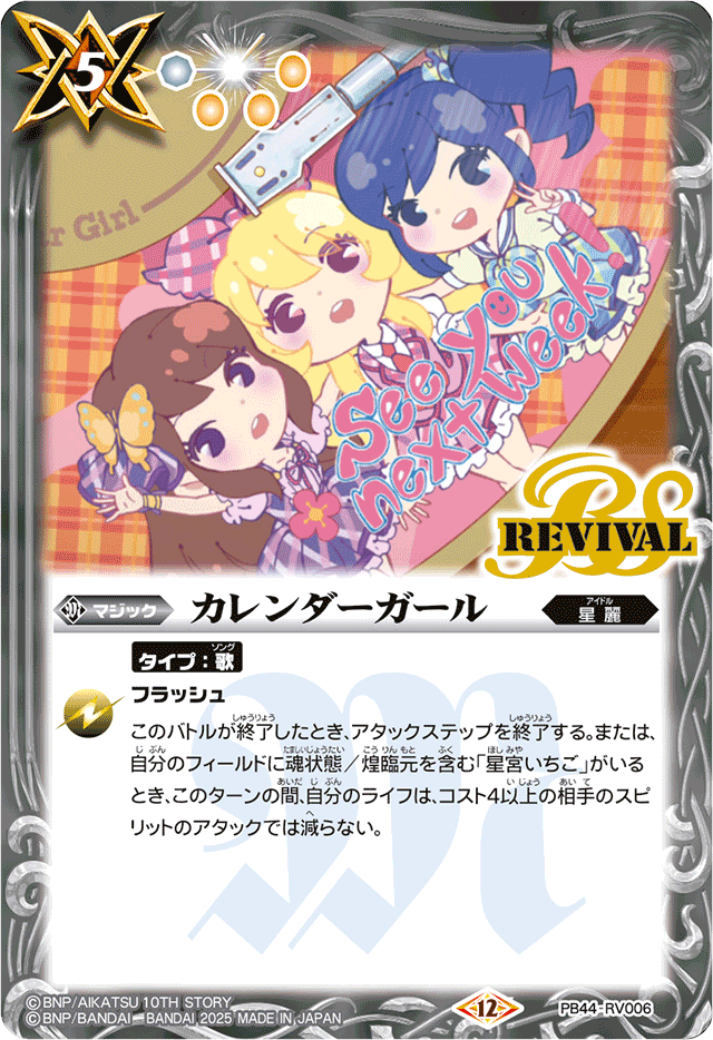 または、自分のフィールドに魂状態/煌臨元を含む「星宮いちご」がいるとき、このターンの間、自分のライフは、コスト4以上の相手のスピリットのアタックでは減らない。