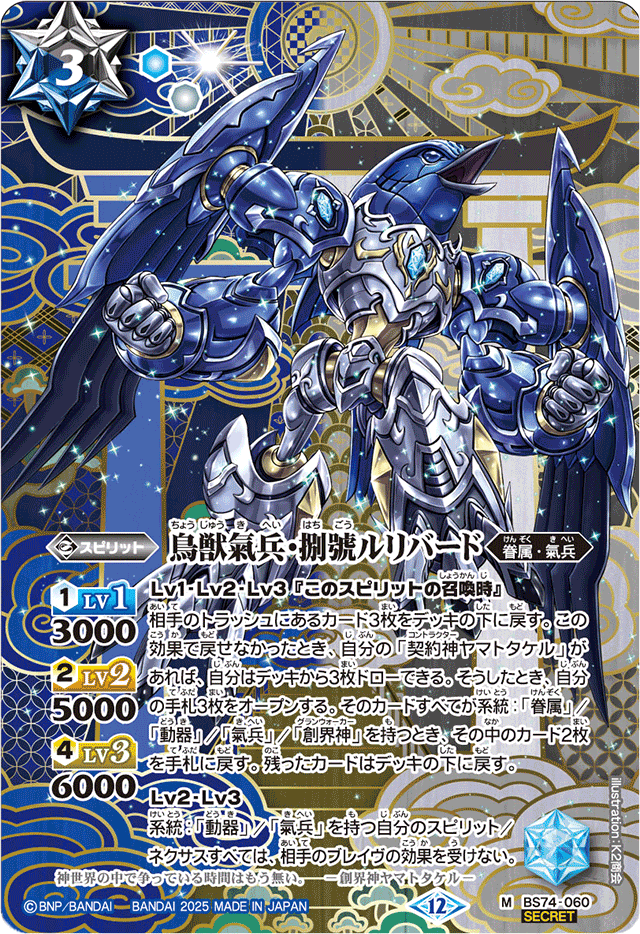 <4>6000Lv1・Lv2・Lv3_『このスピリットの召喚時』相手のトラッシュにあるカード3枚をデッキの下に戻す。この効果で戻せなかったとき、自分の「契約神ヤマトタケル」があれば、自分はデッキから3枚ドローできる。そうしたとき、自分の手札3枚をオープンする。そのカードすべてが系統:「眷属」/「動器」/「氣兵」/「創界神」を持つとき、その中のカード2枚を手札に戻す。残ったカードはデッキの下に戻す。Lv2・Lv3系統:「動器」/「氣兵」を持つ自分のスピリット/ネクサスすべては、相手のブレイヴの効果を受けない。