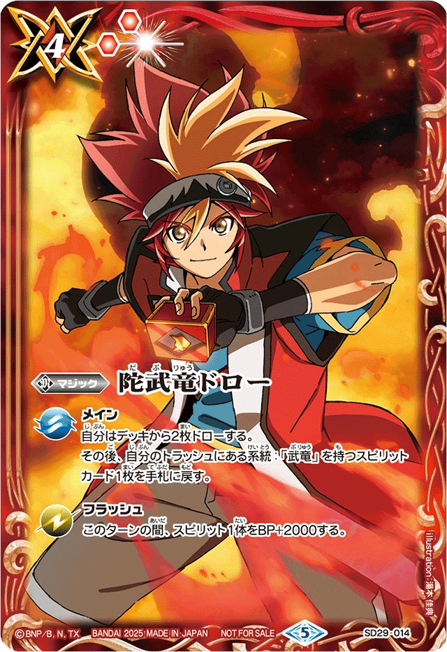 4(2)/赤 メイン: 自分はデッキから2枚ドローする。 その後、自分のトラッシュにある系統:「武竜」を持つスピリットカード1枚を手札に戻す。 フラッシュ: このターンの間、スピリット1体をBP+2000する。