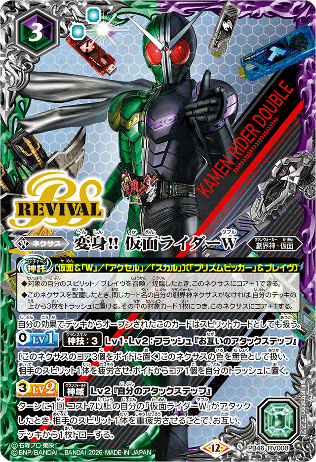 ターンに1回、コスト7以上の自分の「仮面ライダーW」がアタックしたとき、相手のスピリット1体を重疲労させることで、お互い、デッキから1枚ドローする。