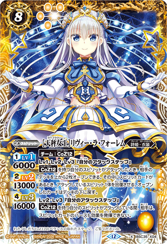 【CoZ12】を持つ自分のスピリットがアタックしたとき、相手のデッキを上から2枚オープンできる。
