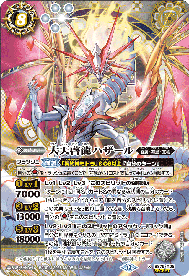 <5>18000フラッシュ__「契約神ミトラ」&C6以上_『自分のターン』_自分の__をトラッシュに置くことで、対象から1コスト支払って手札から召喚する。Lv1・Lv2・Lv3_『このスピリットの召喚時』〔ターンに1回:同名〕カード名の異なる魂状態の自分のカード1枚につき、ボイドからコア1個を自分のスピリットに置ける。この効果でコアを3個以上置いたとき、効果で召喚していたら、自分の__をこのスピリットに置ける。Lv2・Lv3_『このスピリットのアタック/ブロック時』自分の創界神ネクサスの「契約神ミトラ」1つにコア+1できる。その後、魂状態の系統:「覚竜」を持つ自分のカード1枚を手札に戻すことで、このスピリットは回復する。