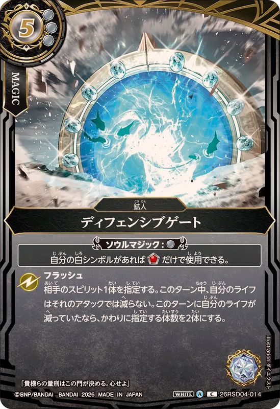 _ソウルマジック:[白]_自分の白シンボルがあれば__だけで使用できる。フラッシュ相手のスピリット1体を指定する。このターン中、自分のライフはそれのアタックでは減らない。このターンに自分のライフが減っていたなら、かわりに指定する体数を2体にする。「貴様らの量刑はこの門が決める。心せよ」