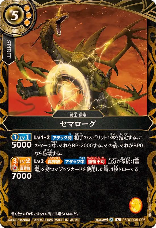 <3>7000Lv1-2_『アタック時』相手のスピリット1体を指定する。このターン中、それをBP-2000する。その後、それがBP0なら破壊する。Lv2_『アタック中』〔重複不可〕_〈真界放〉自分が系統:「雷竜」を持つマジックカードを使用した時、1枚ドローする。