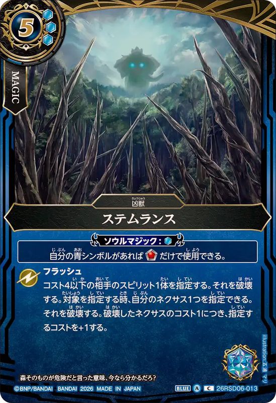 _ソウルマジック:[青]_自分の青シンボルがあれば__だけで使用できる。フラッシュコスト4以下の相手のスピリット1体を指定する。それを破壊する。対象を指定する時、自分のネクサス1つを指定できる。それを破壊する。破壊したネクサスのコスト1につき、指定するコストを+1する。森そのものが危険だと言った意味、今なら分かるだろ?