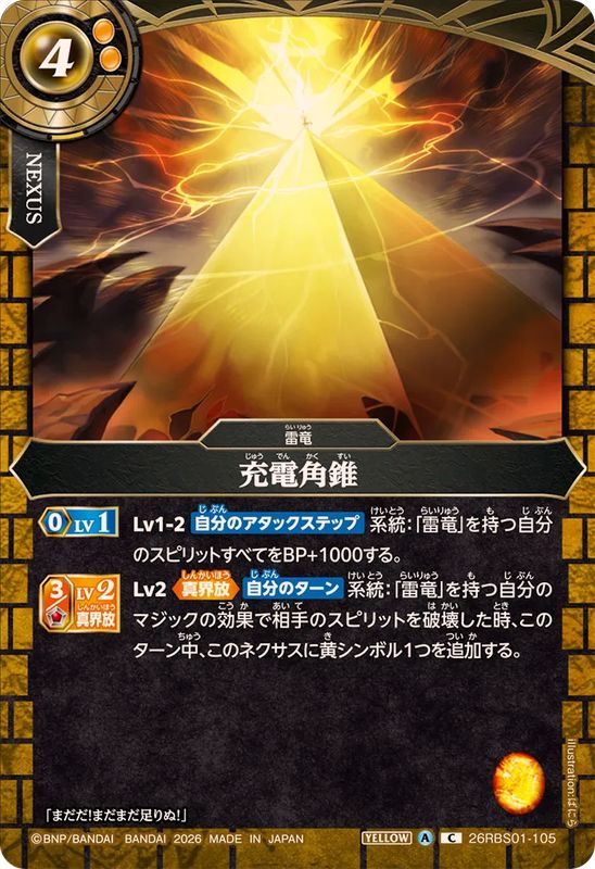 <3>Lv1-2_『自分のアタックステップ』系統:「雷竜」を持つ自分のスピリットすべてをBP+1000する。Lv2《真界放》_『自分のターン』系統:「雷竜」を持つ自分のマジックの効果で相手のスピリットを破壊した時、このターン中、このネクサスに黄シンボル1つを追加する。