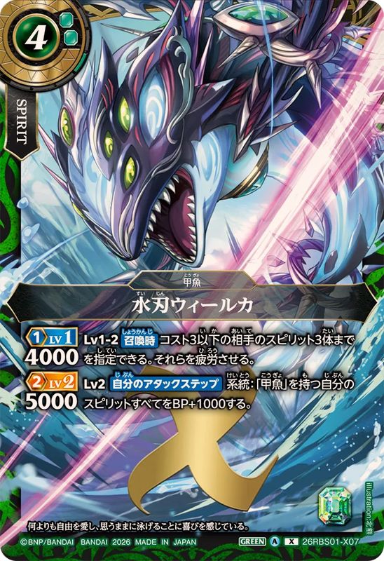<2>5000Lv1-2_『召喚時』コスト3以下の相手のスピリット3体までを指定できる。それらを疲労させる。Lv2_『自分のアタックステップ』系統:「甲魚」を持つ自分のスピリットすべてをBP+1000する。