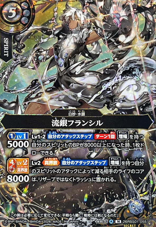 <4>8000Lv1-2_『自分のアタックステップ』〔ターン1回〕_増幅_を持つ自分のスピリットのBPが8000以上になった時、1枚ドローできる。Lv2《真界放》_『自分のアタックステップ』_増幅_を持つ自分のスピリットのアタックによって減る相手のライフのコアは、リザーブではなくトラッシュに置かれる。