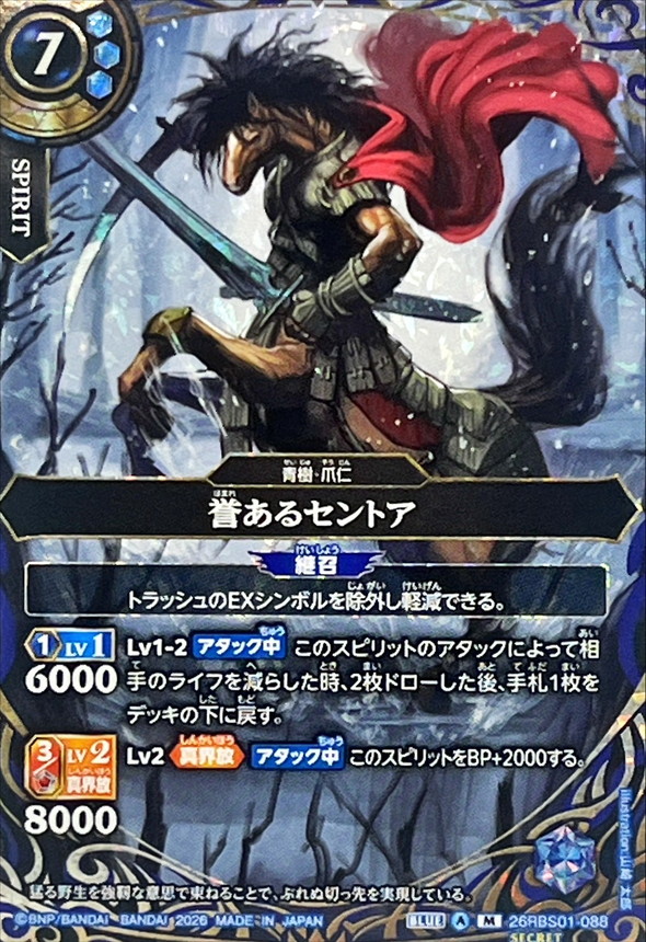 <3>8000_継召_トラッシュのEXシンボルを除外し軽減できる。Lv1-2_『アタック中』このスピリットのアタックによって相手のライフを減らした時、2枚ドローした後、手札1枚をデッキの下に戻す。Lv2《真界放》_『アタック中』このスピリットをBP+2000する。