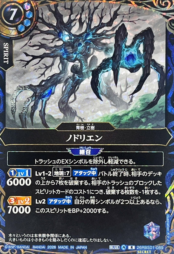 <3>7000_継召_トラッシュのEXシンボルを除外し軽減できる。Lv1-2__地鳴:7__『アタック中』バトル終了時、相手のデッキの上から7枚を破棄する。相手のトラッシュのブロックしたスピリットカードのコスト1につき、破棄する枚数を-1枚する。Lv2_『アタック中』自分の青シンボルが2つ以上あるなら、このスピリットをBP+2000する。