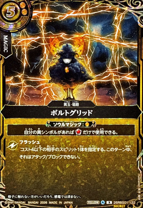 _ソウルマジック:[黄]_自分の黄シンボルがあれば__だけで使用できる。フラッシュコスト4以下の相手のスピリット1体を指定する。このターン中、それはアタック/ブロックできない。格子に触れない方がいいだろう。感電では済まない。