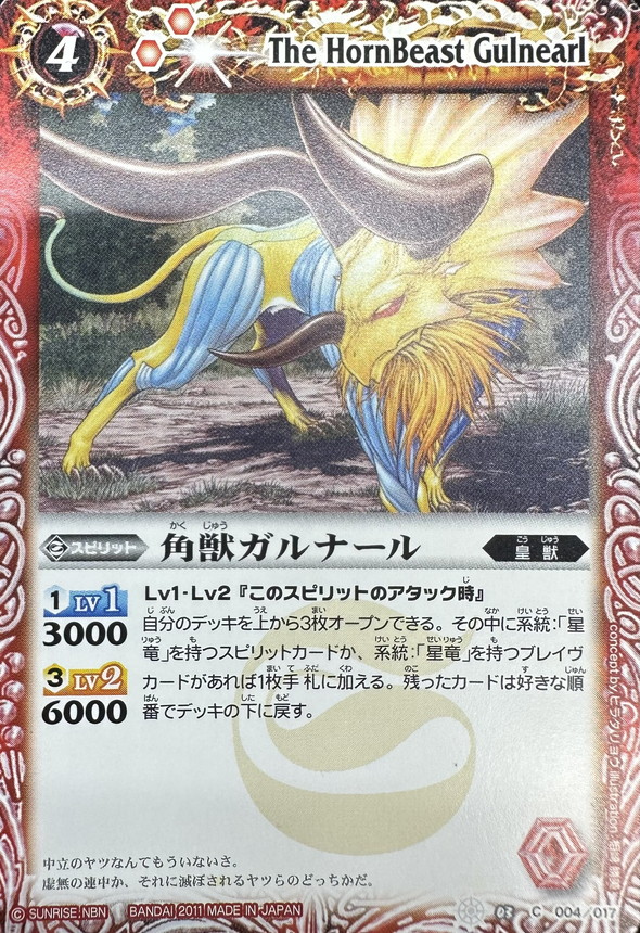 4(2)/赤/皇獣 <1>Lv1 3000 <3>Lv2 6000 Lv1/Lv2『このスピリットのアタック時』 自分のデッキを上から3枚オープンできる。 その中に系統:「星竜」を持つスピリットカードか、 系統:「星竜」を持つブレイヴカードがあれば1枚手札に加える。 残ったカードは好きな順番でデッキの下に戻す。 シンボル:赤 コンセプト:ヒラタリョウ イラスト:相崎勝美 フレーバーテキスト: 中立のヤツなんてもういないさ。 虚無の連中か、それに滅ぼされるヤツらのどっちかだ