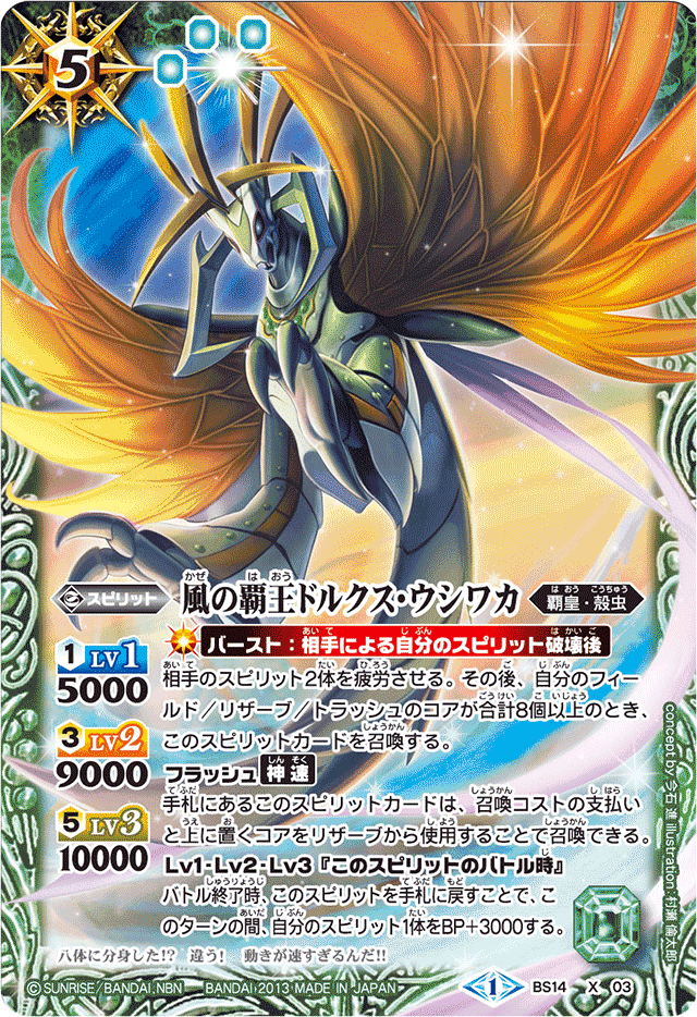 5(3)/緑/覇皇/殻虫 <1>Lv1 5000 <3>Lv2 9000 <5>Lv3 10000 【バースト:相手による自分のスピリット破壊後】 相手のスピリット2体を疲労させる。 その後、自分のフィールド/リザーブ/トラッシュのコアが合計8個以上のとき、このスピリットカードを召喚する。 フラッシュ【神速】 手札にあるこのスピリットカードは、召喚コストの支払いと上に置くコアをリザーブから使用することで召喚できる。 Lv1/Lv2/Lv3 『このスピリットのバトル時』 バトル終了時、このスピリットを手札に戻すことで、このターンの間、自分のスピリット1体をBP+3000する。 シンボル:緑 コンセプト:今石進 イラスト:村瀬倫太郎 フレーバーテキスト: 八体に分身した!? 違う! 動きが速すぎるんだ!!