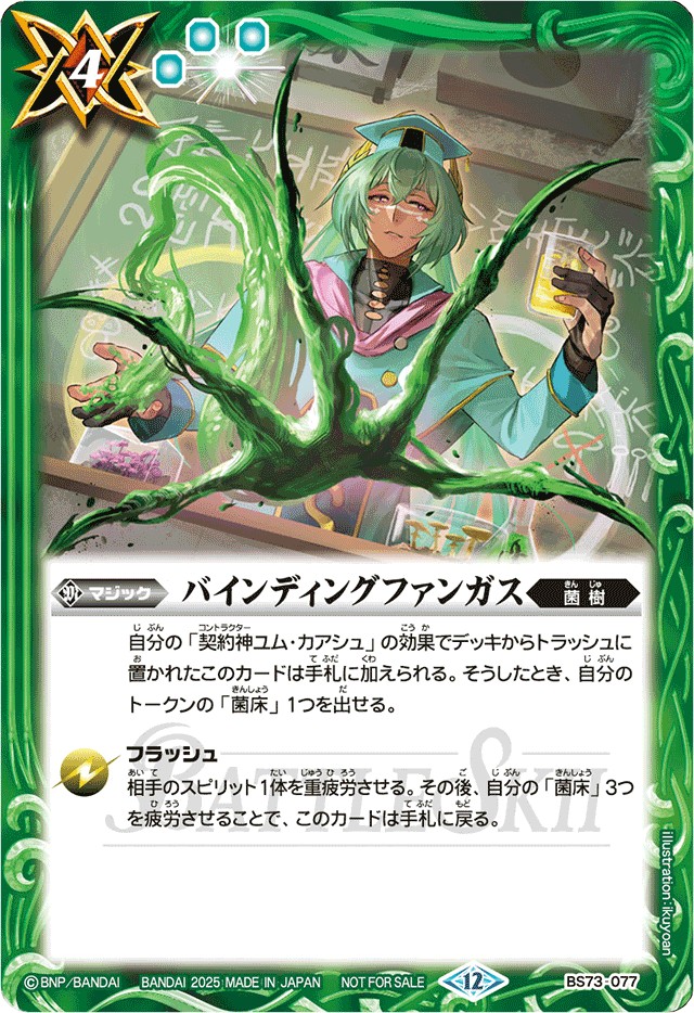 自分の「契約神ユム・カアシュ」の効果でデッキからトラッシュに置かれたこのカードは手札に加えられる。そうしたとき、自分のトークンの「菌床」1つを出せる。フラッシュ相手のスピリット1体を重疲労させる。その後、自分の「菌床」3つを疲労させることで、このカードは手札に戻る。