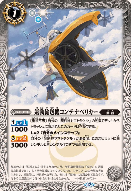 <3>3000〔重複不可〕自分の「契約神ヤマトタケル」の効果でデッキからトラッシュに置かれたこのカードは召喚できる。Lv2_『自分のメインステップ』自分の「契約神ヤマトタケル」がある間、このスピリットに白シンボルと青シンボル1つずつを追加する。