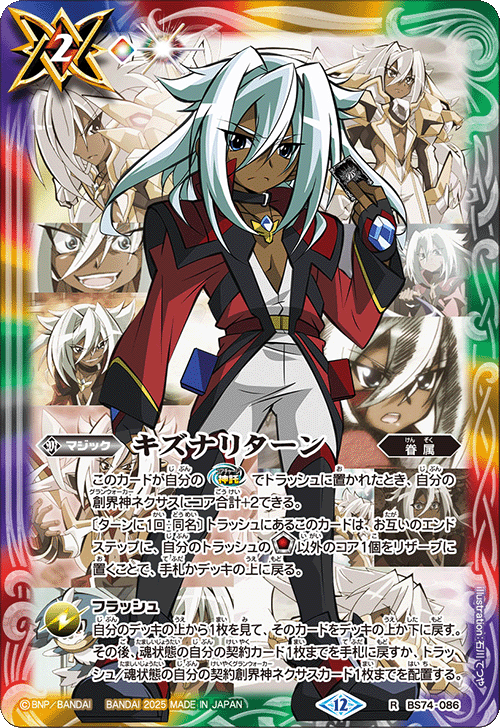 このカードが自分のでトラッシュに置かれたとき、自分の創界神ネクサスにコア合計+2できる。〔ターンに1回:同名〕トラッシュにあるこのカードは、お互いのエンドステップに、自分のトラッシュの__以外のコア1個をリザーブに置くことで、手札かデッキの上に戻る。フラッシュ自分のデッキの上から1枚を見て、そのカードをデッキの上か下に戻す。その後、魂状態の自分の契約カード1枚までを手札に戻すか、トラッシュ/魂状態の自分の契約創界神ネクサスカード1枚までを配置する。