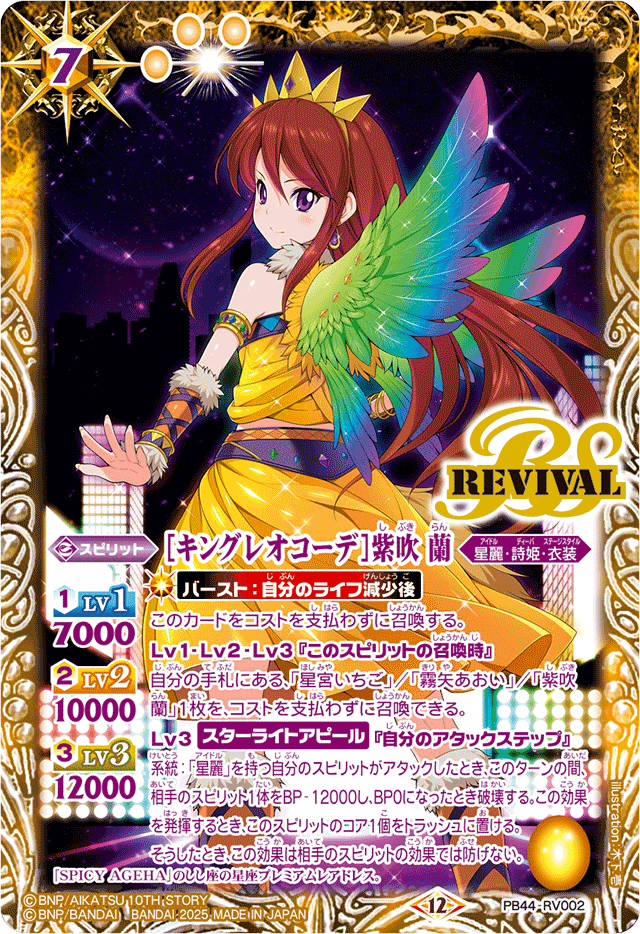 系統:「星麗」を持つ自分のスピリットがアタックしたとき、このターンの間、相手のスピリット1体をBP-12000し、BP0になったとき破壊する。