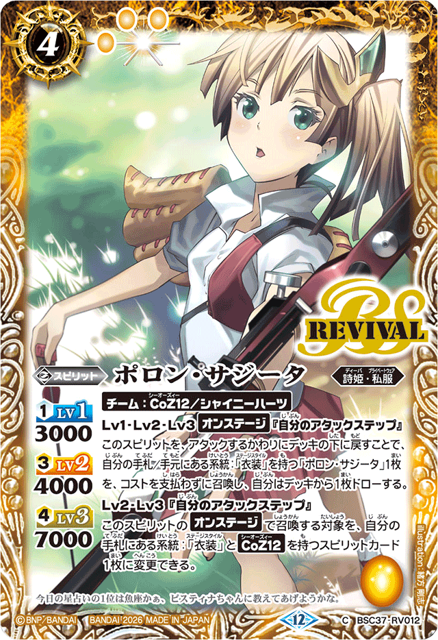 このスピリットを、アタックするかわりにデッキの下に戻すことで、自分の手札/手元にある系統:「衣装」を持つ「ポロン・サジータ」1枚を、コストを支払わずに召喚し、自分はデッキから1枚ドローする。