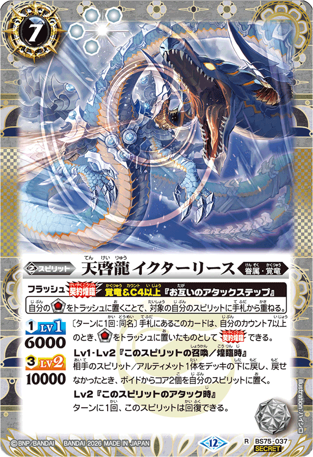 <3>10000フラッシュ__覚竜&C4以上_『お互いのアタックステップ』_自分の__をトラッシュに置くことで、対象の自分のスピリットに手札から重ねる。〔ターンに1回:同名〕手札にあるこのカードは、自分のカウント7以上のとき、__をトラッシュに置いたものとしてできる。Lv1・Lv2_『このスピリットの召喚/煌臨時』相手のスピリット/アルティメット1体をデッキの下に戻し、戻せなかったとき、ボイドからコア2個を自分のスピリットに置く。Lv2_『このスピリットのアタック時』ターンに1回、このスピリットは回復できる。