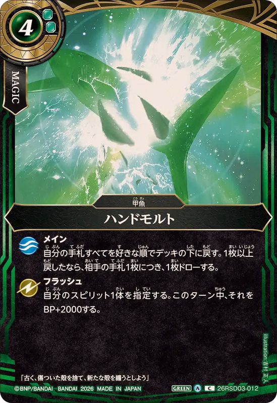 メイン自分の手札すべてを好きな順でデッキの下に戻す。1枚以上戻したなら、相手の手札1枚につき、1枚ドローする。フラッシュ自分のスピリット1体を指定する。このターン中、それをBP+2000する。「古く、傷ついた殻を捨て、新たな殻を纏うとしよう」