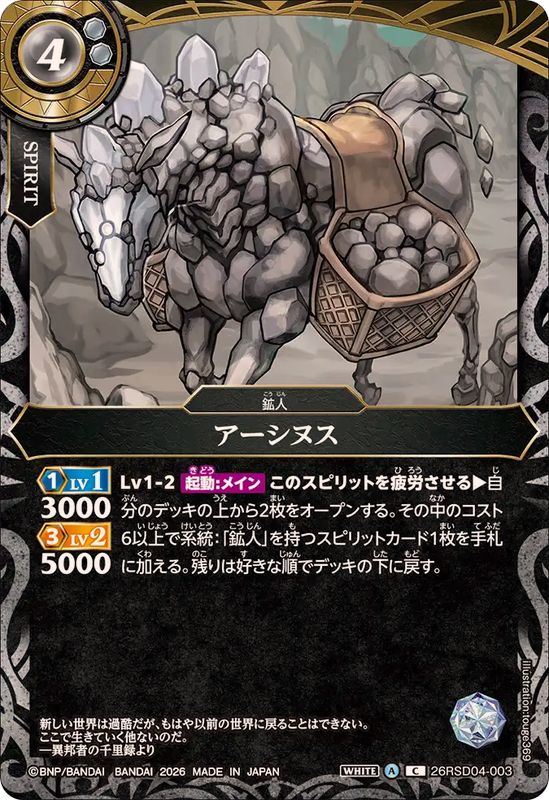<3>5000Lv1-2〔起動:メイン〕このスピリットを疲労させる_自分のデッキの上から2枚をオープンする。その中のコスト6以上で系統:「鉱人」を持つスピリットカード1枚を手札に加える。残りは好きな順でデッキの下に戻す。