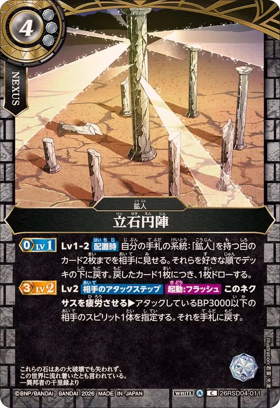 <3>Lv1-2_『配置時』自分の手札の系統:「鉱人」を持つ白のカード2枚までを相手に見せる。それらを好きな順でデッキの下に戻す。戻したカード1枚につき、1枚ドローする。Lv2_『相手のアタックステップ』〔起動_フラッシュ_〕このネクサスを疲労させる_アタックしているBP3000以下の相手のスピリット1体を指定する。それを手札に戻す。