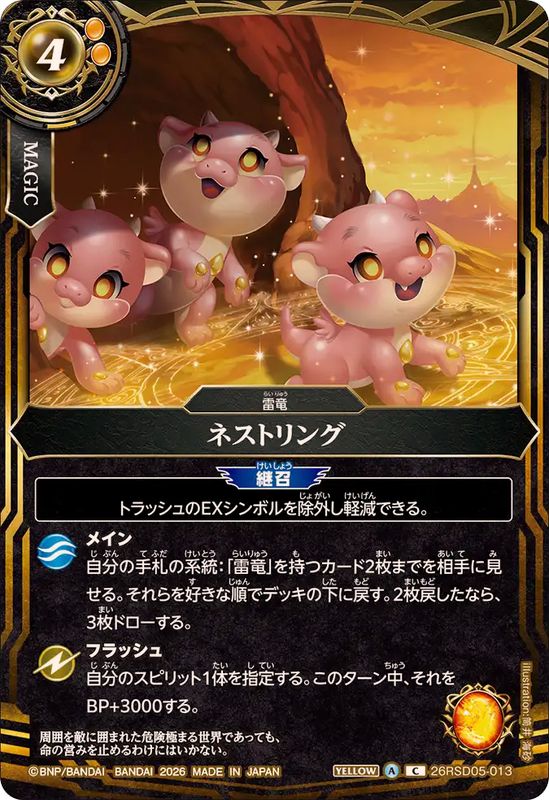 _継召_トラッシュのEXシンボルを除外し軽減できる。メイン自分の手札の系統:「雷竜」を持つカード2枚までを相手に見せる。それらを好きな順でデッキの下に戻す。2枚戻したなら、3枚ドローする。フラッシュ自分のスピリット1体を指定する。このターン中、それをBP+3000する。周囲を敵に囲まれた危険極まる世界であっても、命の営みを止めるわけには行かない。