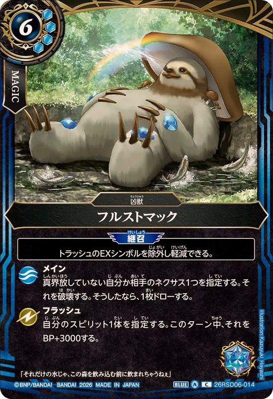 _継召_トラッシュのEXシンボルを除外し軽減できる。メイン真界放していない自分か相手のネクサス1つを指定する。それを破壊する。そうしたなら、1枚ドローする。フラッシュ自分のスピリット1体を指定する。このターン中、それをBP+3000する。「それだけの水じゃ、この森を飲み込む前に飲まれちゃうねぇ」