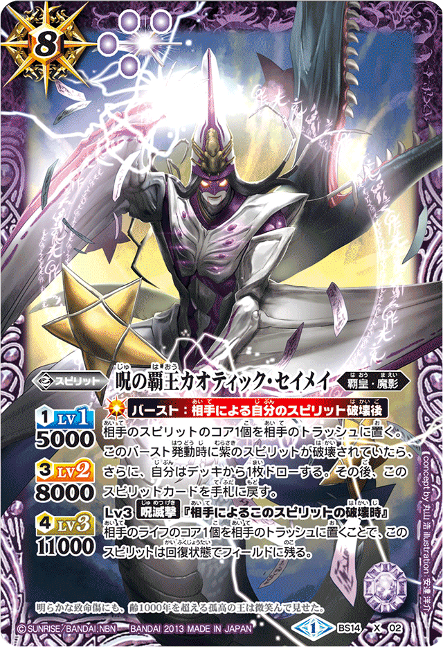 8(4)/紫/覇皇/魔影 <1>Lv1 5000 <3>Lv2 8000 <4>Lv3 11000 【バースト:相手による自分のスピリット破壊後】 相手のスピリットのコア1個を相手のトラッシュに置く。 このバースト発動時に紫のスピリットが破壊されていたら、さらに、自分はデッキから1枚ドローする。 その後、このスピリットカードを手札に戻す。 Lv3【呪滅撃】『相手によるこのスピリットの破壊時』 相手のライフのコア1個を相手のトラッシュに置くことで、このスピリットは回復状態でフィールドに残る。 シンボル:紫 コンセプト:丸山浩 イラスト:タカヤマトシアキ イラスト:安達洋介(ドリームブースター【バーストインパクト】) フレーバーテキスト: 明らかな致命傷にも、齢1000年を超える孤高の王は微笑んで見せた。